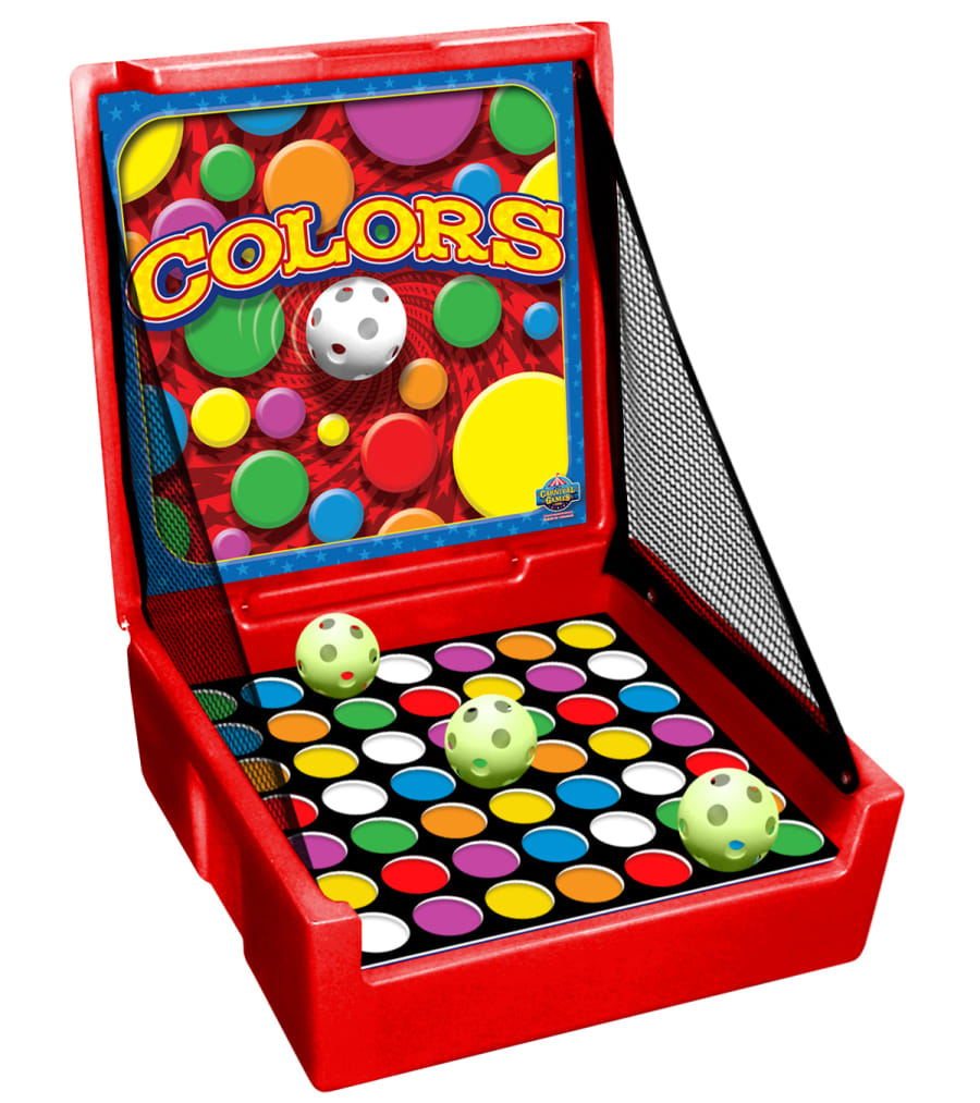In the Colors carnival game, toss two wiffle balls onto the game board to try and get a color match. Toss three balls for added difficulty.