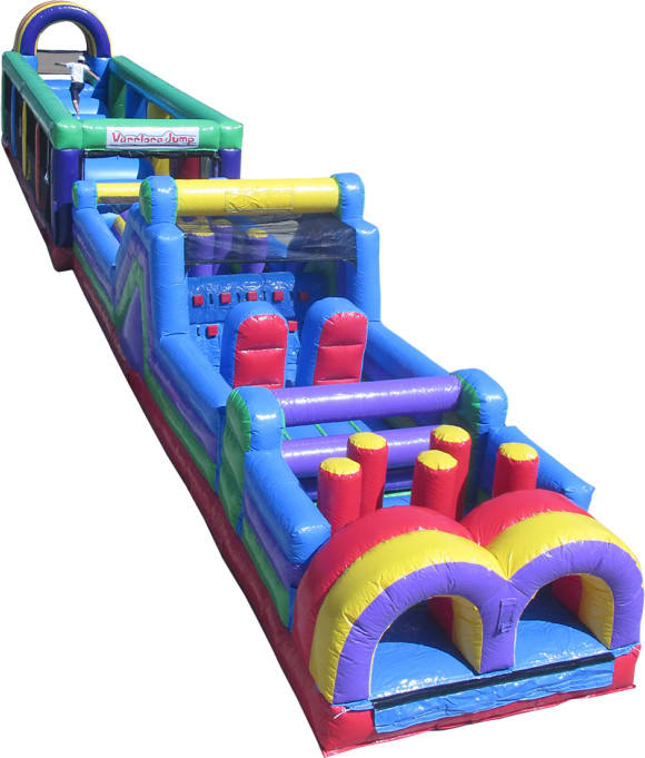 The Warrior Jump / Obstacle course challenge is 90' of challenging jumps and obstacles and is great for ages 7 and up. You'll compete against your friends to see who can navigate all the jumps, ducks, and crawl thrus before finally sliding out safely at the end of this Awesome 2 piece interactive. 3 electrical outlets required.