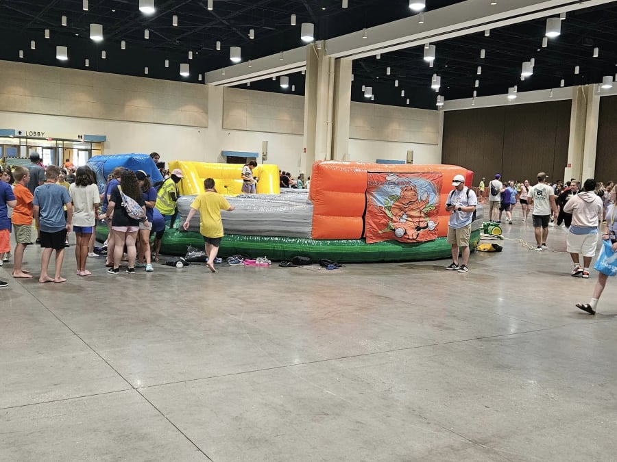 This inflatable take a childhood board game and brings it to Life! 4 players become Hungry, Hungry Humans as they bungee back and forth and see who can gobble up the most balls in this physically challenging game. You'll need an area of 40x40 and 1 electrical outlet.