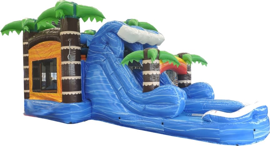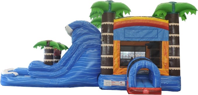 Featuring a spacious bounce area, a climbing wall, a slide, and a splash pool, this combo unit offers endless entertainment possibilities for guests of all ages. Whether you're looking for a fun way to cool off on a hot summer day or simply want to add some excitement to your party, the 5n1 Tropical Wet/Dry Combo has got you covered!